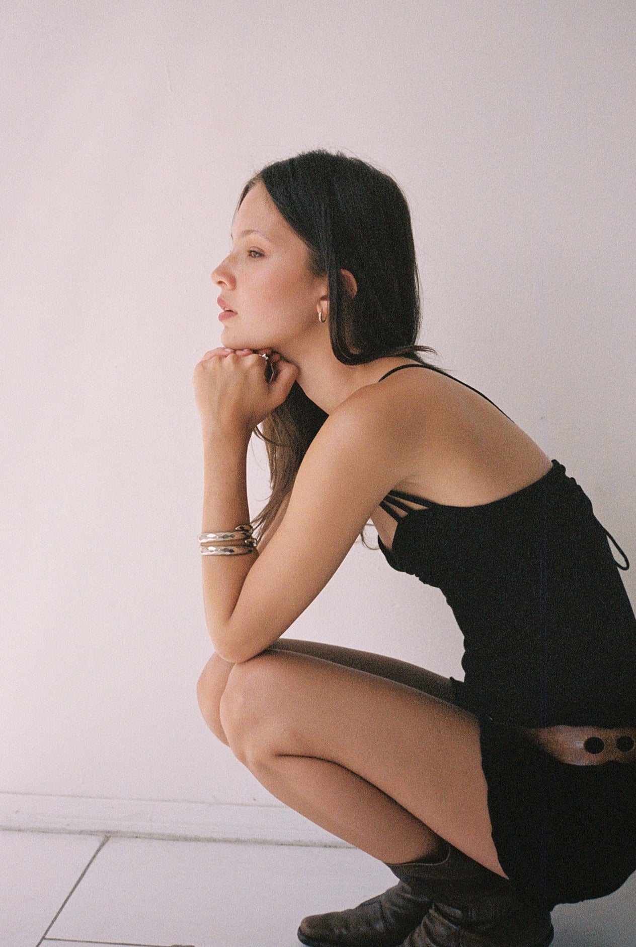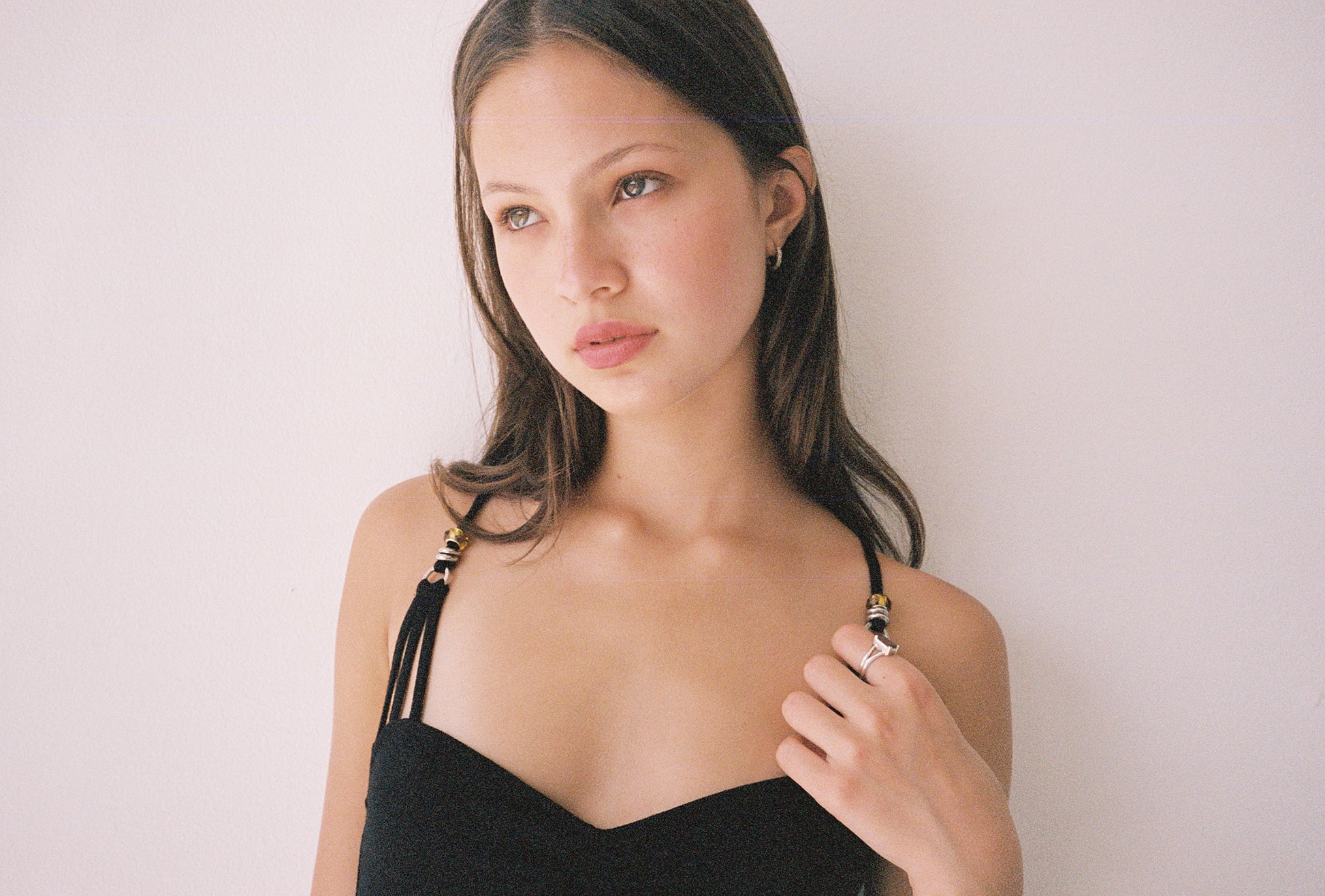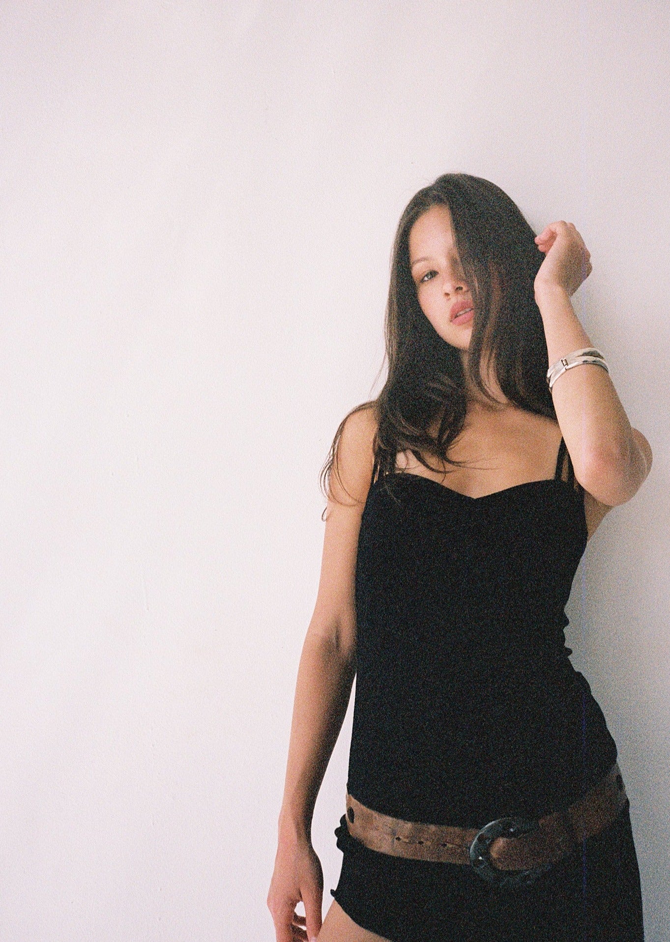 The Maura is a sleeveless mini dress made in a soft stretch jersey and gives you a little shape in the areas where you might want it, as you can tie the back and adjust as you like.