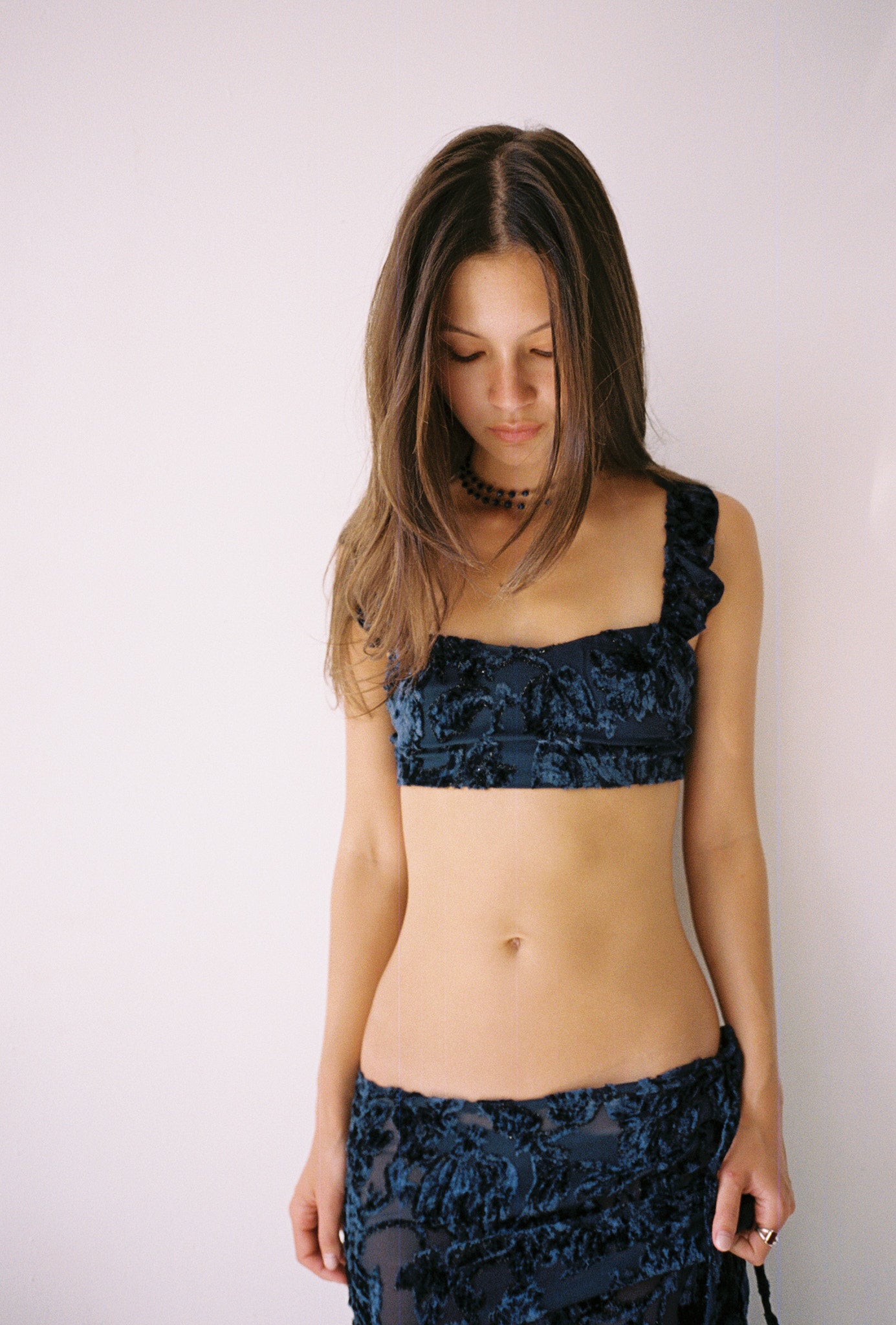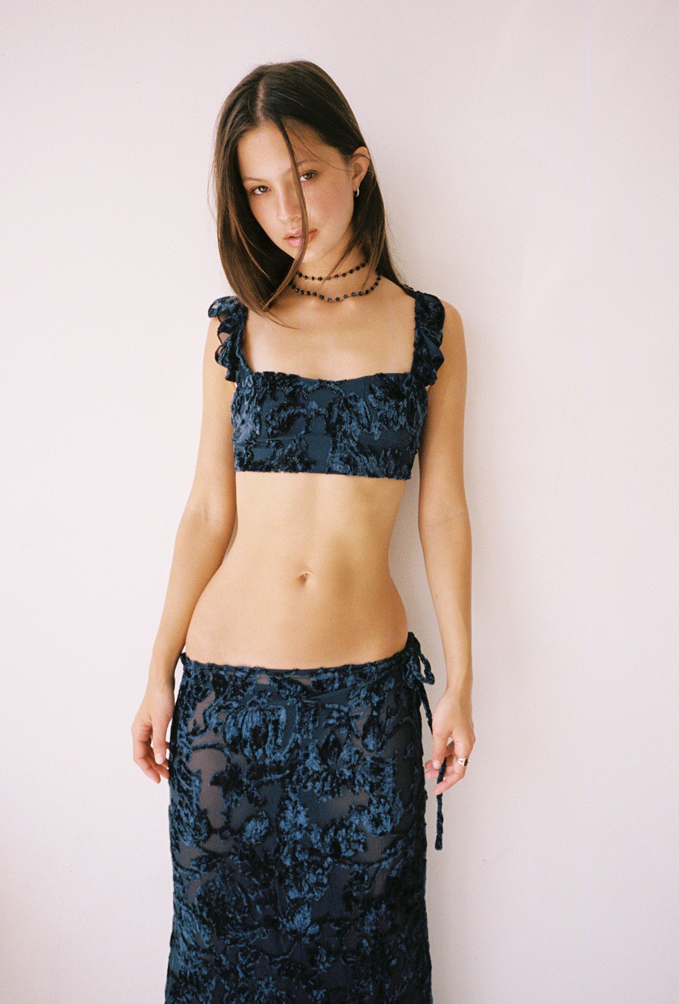 This bralette top is made in a lustrous silk velvet with a delicate ruffle over the shoulder and ties in the back for adjustability